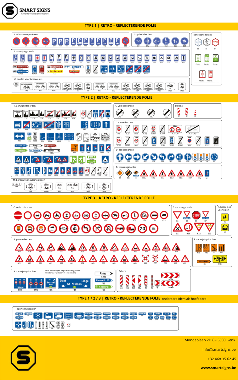 Ontdek de officiële SB250-pancarte – een compleet overzicht van alle mogelijke signalisatie, gestructureerd volgens reflectieklasse.